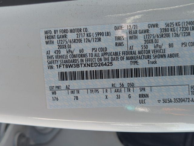 Oxford White 2022 Ford F-350SD Platinum 4WD 10-Speed Automatic Power Stroke 6.7L V8 DI 32V OHV Turbodiesel LIFT/WHEELS/TIRES, POWER RUNNING STEPS, 4WD, FX4 Off-Road Package, Hill Descent Control, Off-Road Specifically Tuned Shock Absorbers, Unique FX4 Off-Road Box Decal.